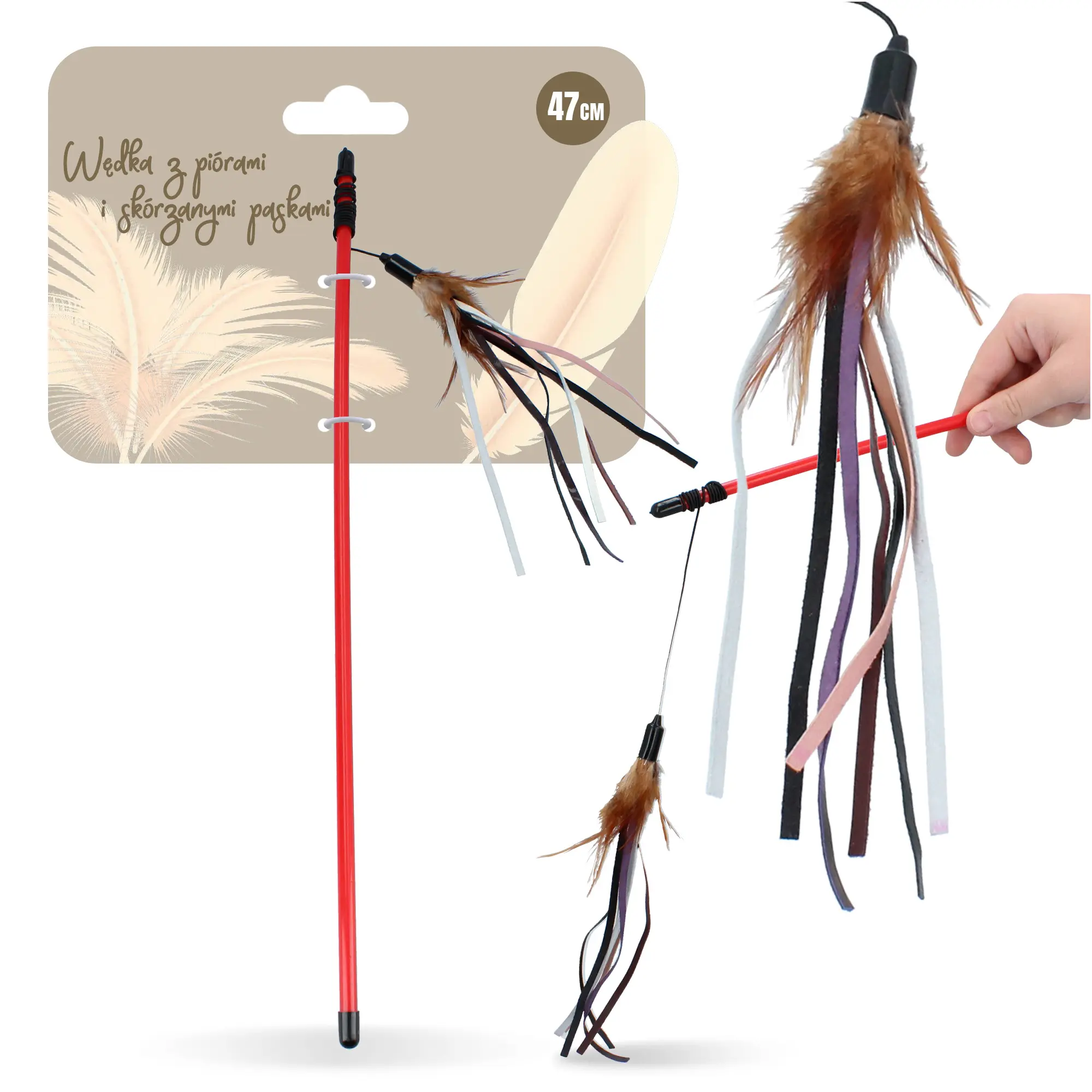 Postaw na estetyczną i wytrzymałą wędkę z paskami skórzanymi i piórami. Twój kot ją pokocha, a Ty obudzisz w nim instynkt prawdziwego łowcy.