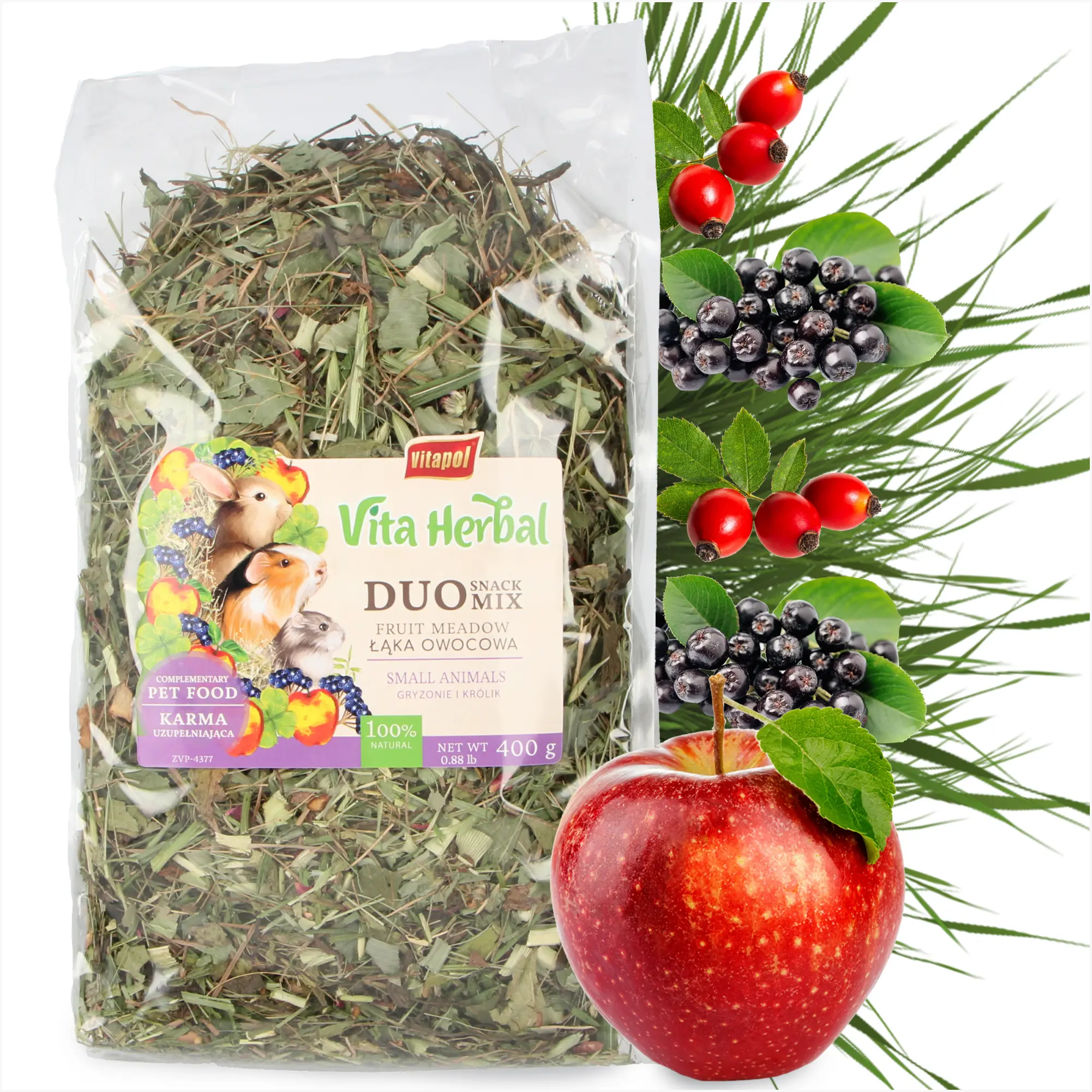 Mix opiera się na różnorodnych warzywach, owocach, kwiatach i aromatycznym sianku. Są to składniki najwyższej jakości, a co najważniejsze - w 100% naturalne.