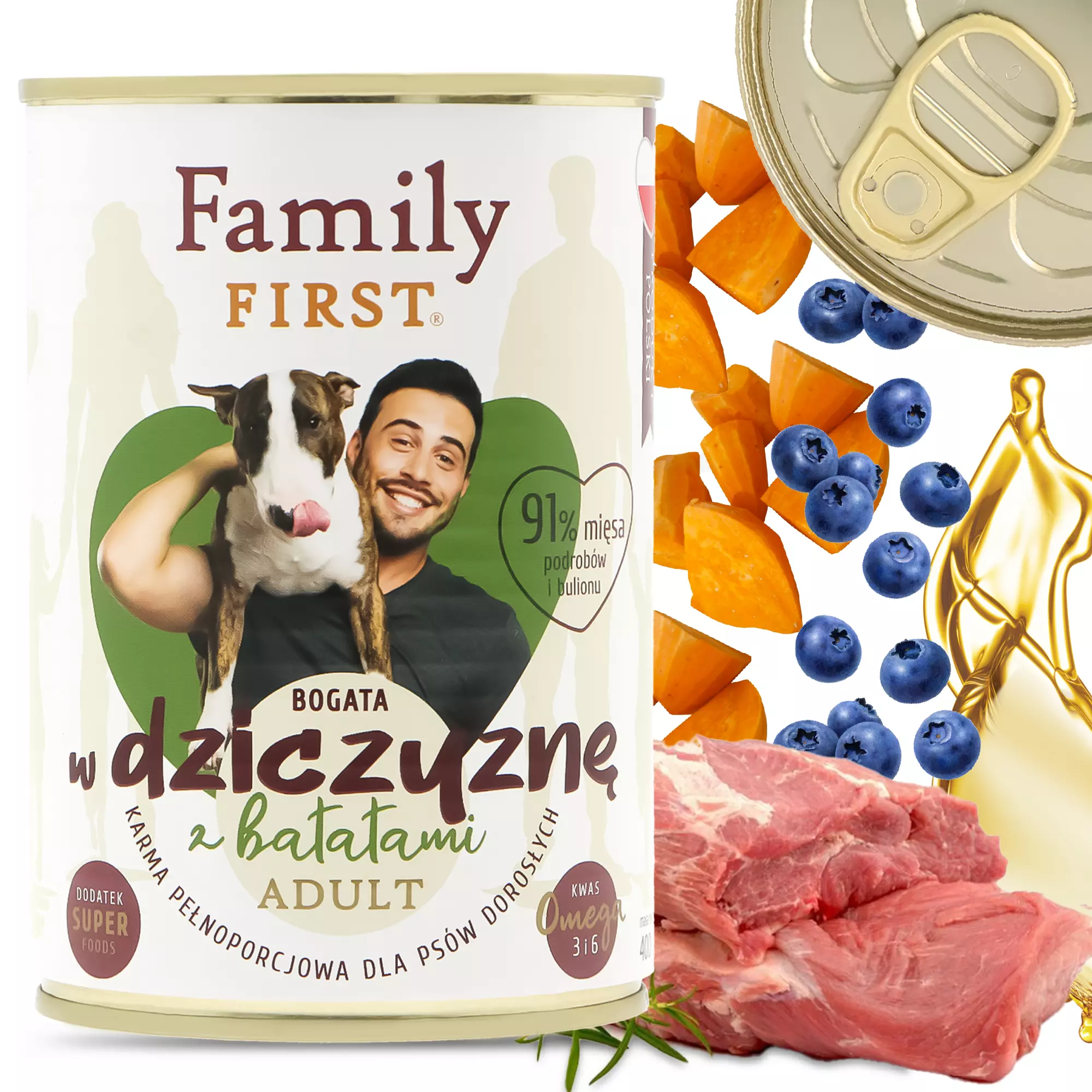 Postaw na kompleksowe żywienie i wybierz mu karmę Family First z dziczyzną i dodatkiem batata. To pełnowartościowy posiłek, który spełnia wszystkie potrzeby żywieniowe dorosłego psa.