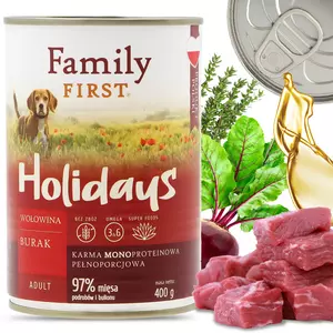 Karma wilgotna Family First z soczystą wołowiną i burakami to produkt dla każdego pupila - nie istotne, czy jest on małej rasy, czy to duży osobnik.