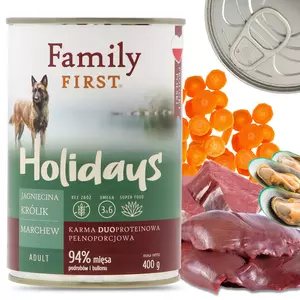 Doskonałym wyborem dla Twojego pupila będzie mokra karma Family First, wzbogacona o mięso jagnięce oraz królicze, a także zdrowy dodatek marchewki.
