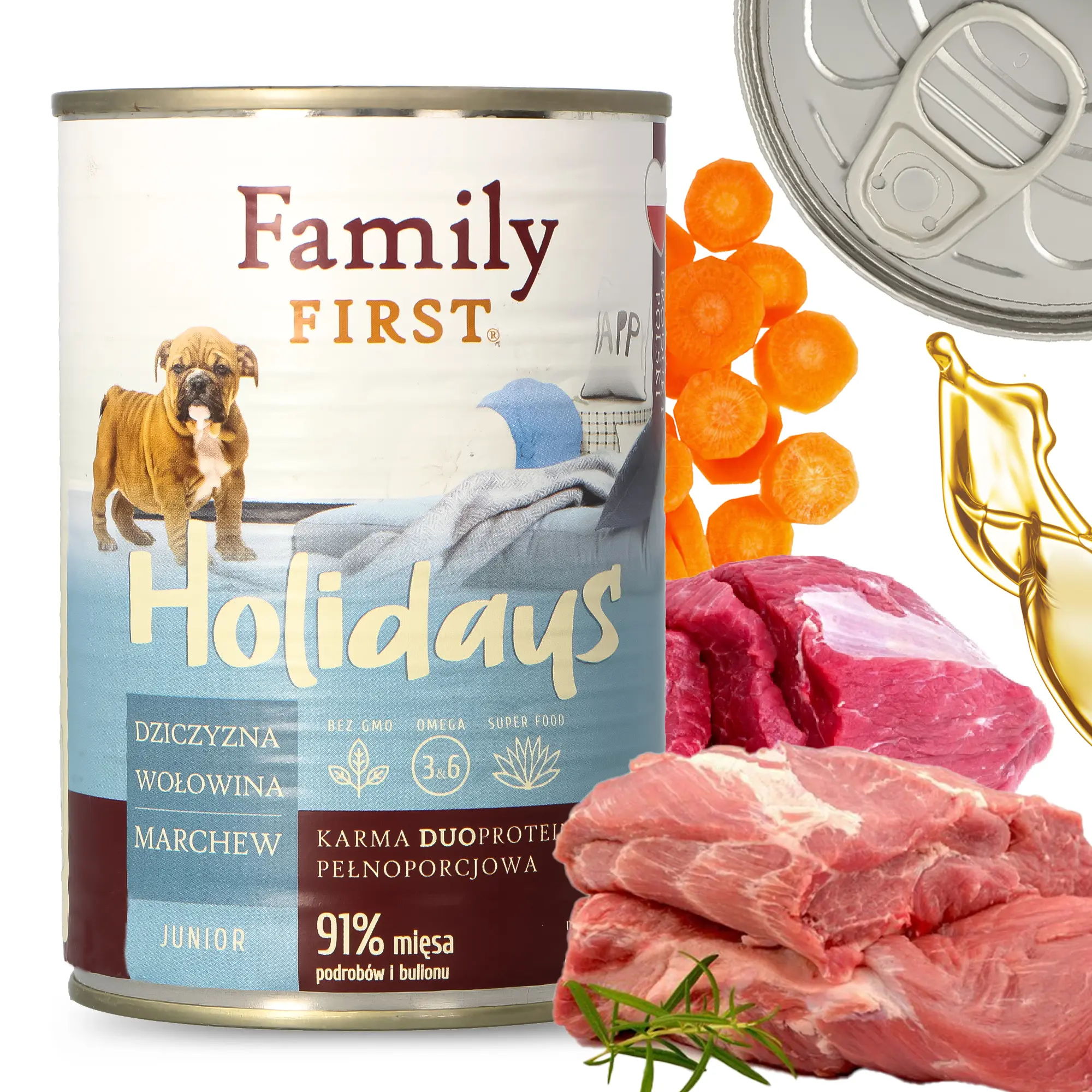 Karma mokra Family First Junior z dziczyzną, wołowiną i marchewką to doskonały produkt, który można podawać najbardziej wrażliwym psiakom. Jej skład zaspokaja wszystkie potrzeby żywieniowe i dba o zdrowie zwierzaka.
