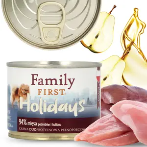 Karma mokra Family First Holidays z indykiem, królikiem i gruszką to idealna podstawa diety stworzona specjalnie dla psów małych ras. Produkt ma doskonały smak i aromat, które skutecznie zachęcają psiaka do jedzenia.