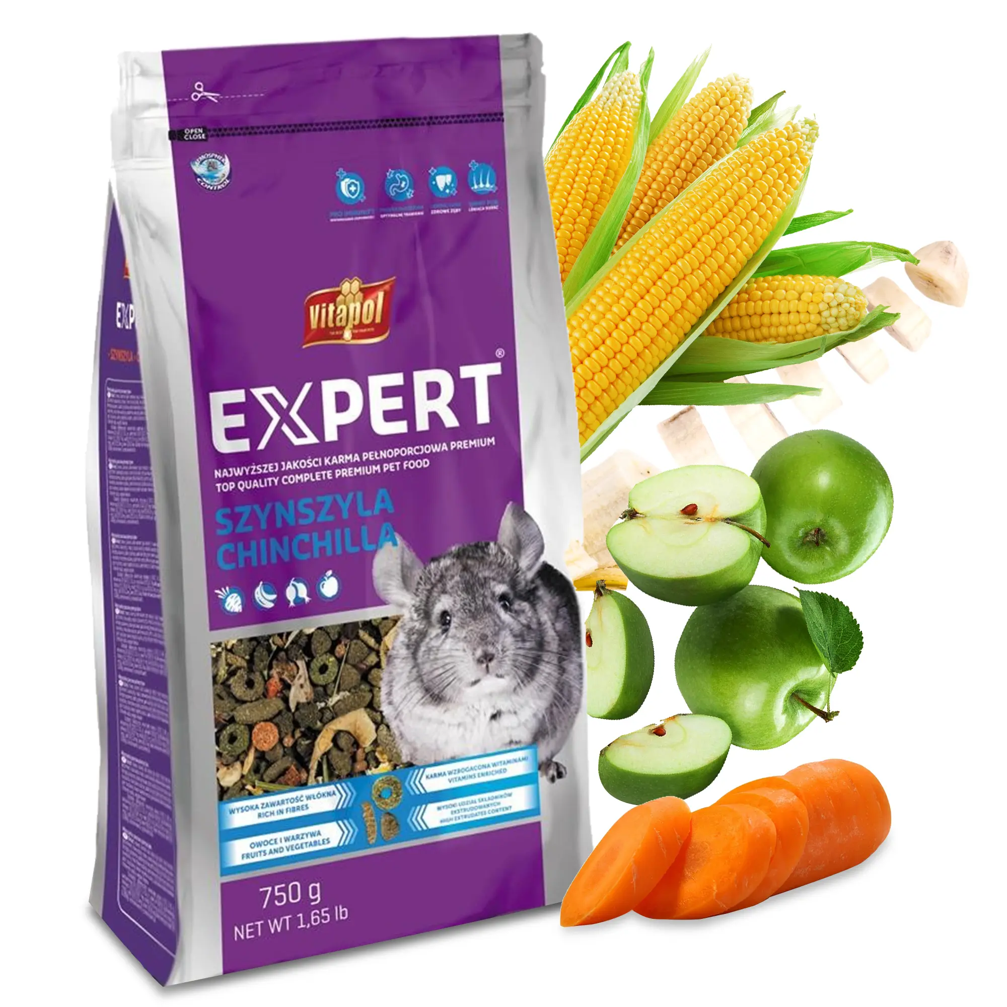 | Skład | Tymotka, lucerna, łuski sojowe, mączka sojowa, makuch z nasion słonecznika, jęczmień, kukurydza, pszenica, otręby pszenne, płatki kukurydzy, płatki grochowe, marchew suszona, topinambur suszony, owoc róży suszony, jabłko suszone, banan suszony, pasternak suszony, burak suszony, papryka suszona, mąka ryżowa, skrobia kukurydziana, pulpa buraczana, skrobia ziemniaczana, pulpa jabłkowa, zioła (bazylia, rozmaryn, mięta pieprzowa, tymianek), węglan wapnia, chlorek sodu, juka. |