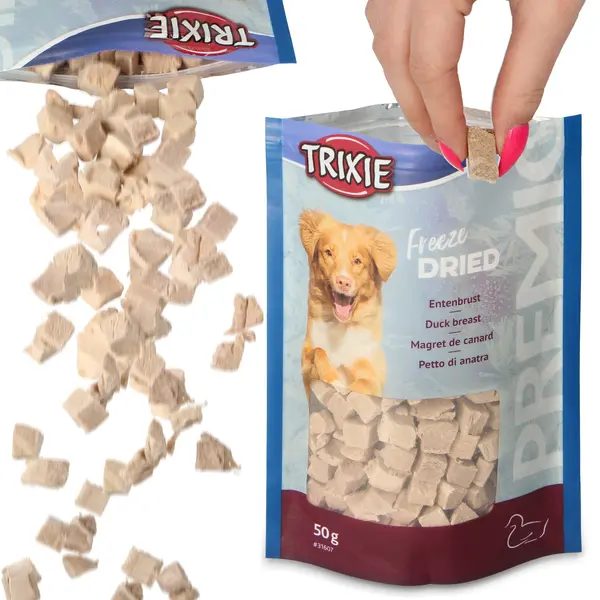 | Skład | Pierś z kaczki, liofilizowana (99%), skrobia z tapioki. |