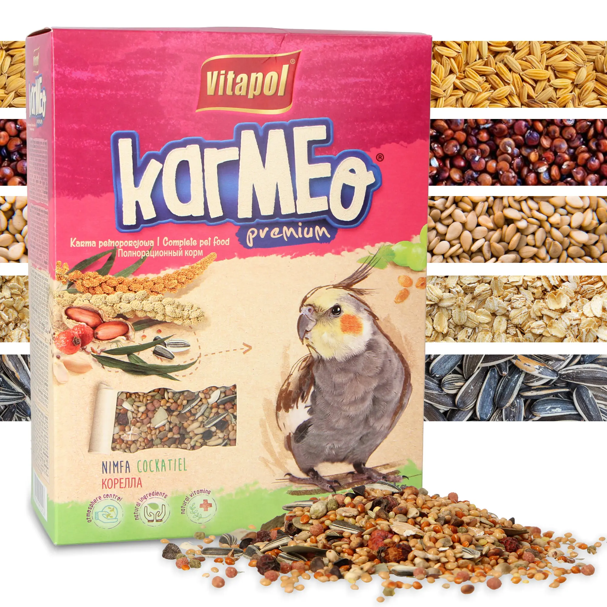 | Skład | Proso żółte (36%), proso czerwone (15%), proso białe, nasiona mozgi kanaryjskiej, owies łuskany, gryka, siemię lniane (3%), sorgo białe, sorgo czerwone, nasiona krokoszu barwierskiego, nasiona konopi, orzech ziemny (2%), płatki pszenne, nasiona słonecznika paskowane (1,5%), mąka sojowa, mąka z ziarna kukurydzy, nasiona dyni obłuszczone, owoc głogu (1%),suszony, owoc jarzębiny suszony, nasiona słonecznika białe, rodzynki (0,5%), liść eukaliptusa suszony (0,5%), mąka z ziarna pszenicy, mączka z lucerny, papaja proszek, olej lniany, węglan wapnia, fosforan dwuwapniowy, |