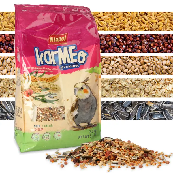 Pokarm Karmeo® Premium wyróżnia się bogatym składem, który odpowiada wszystkim potrzebom żywieniowym papugi nimfy. Pokarm zawiera podstawowy niezbędny bukiet ziaren oraz zdrowe i smaczne dodatki takie jak: