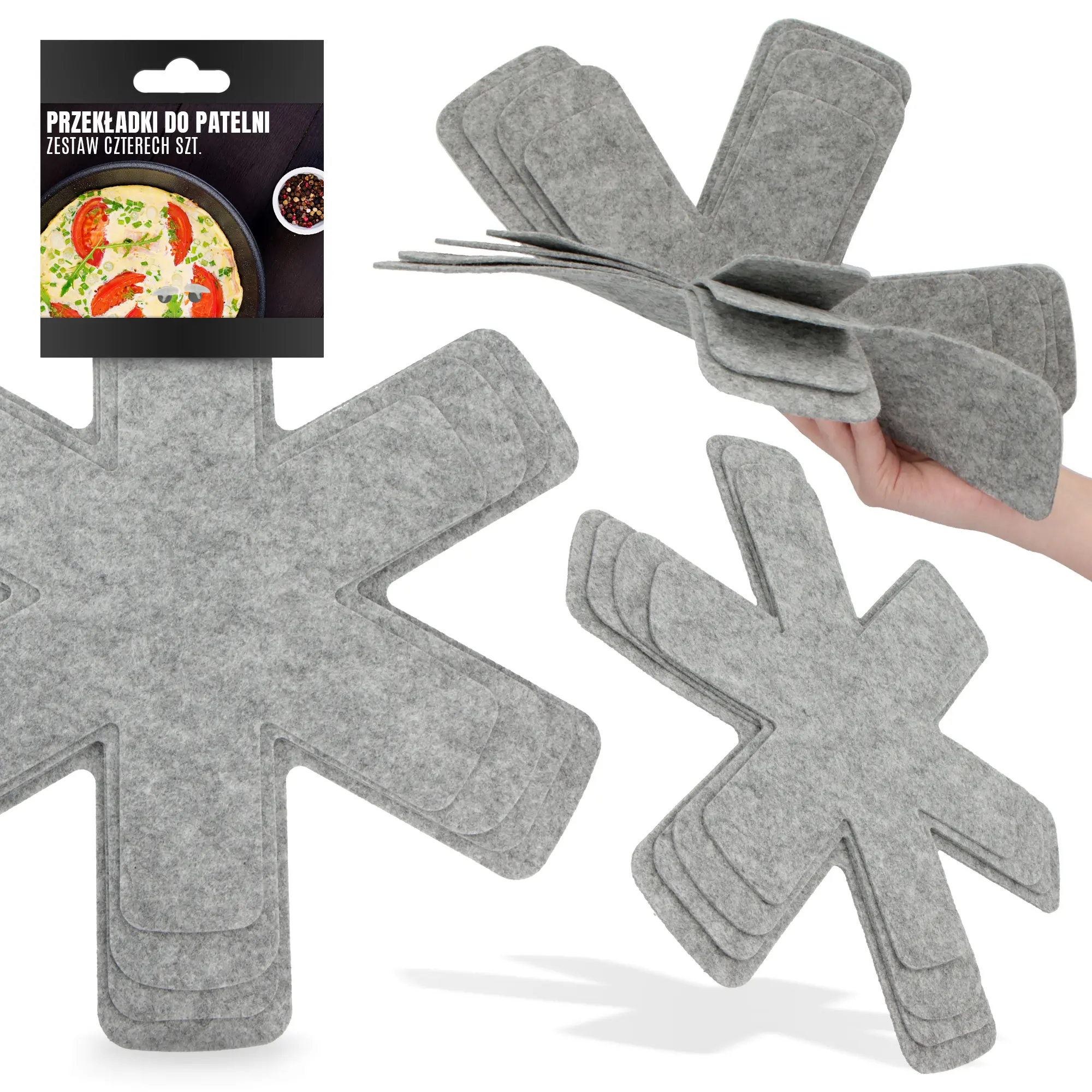 W skład zestawu wchodzą aż cztery przekładki w różnych rozmiarach. Dzięki temu można bez problemu dopasować je do każdej patelni i garnka.