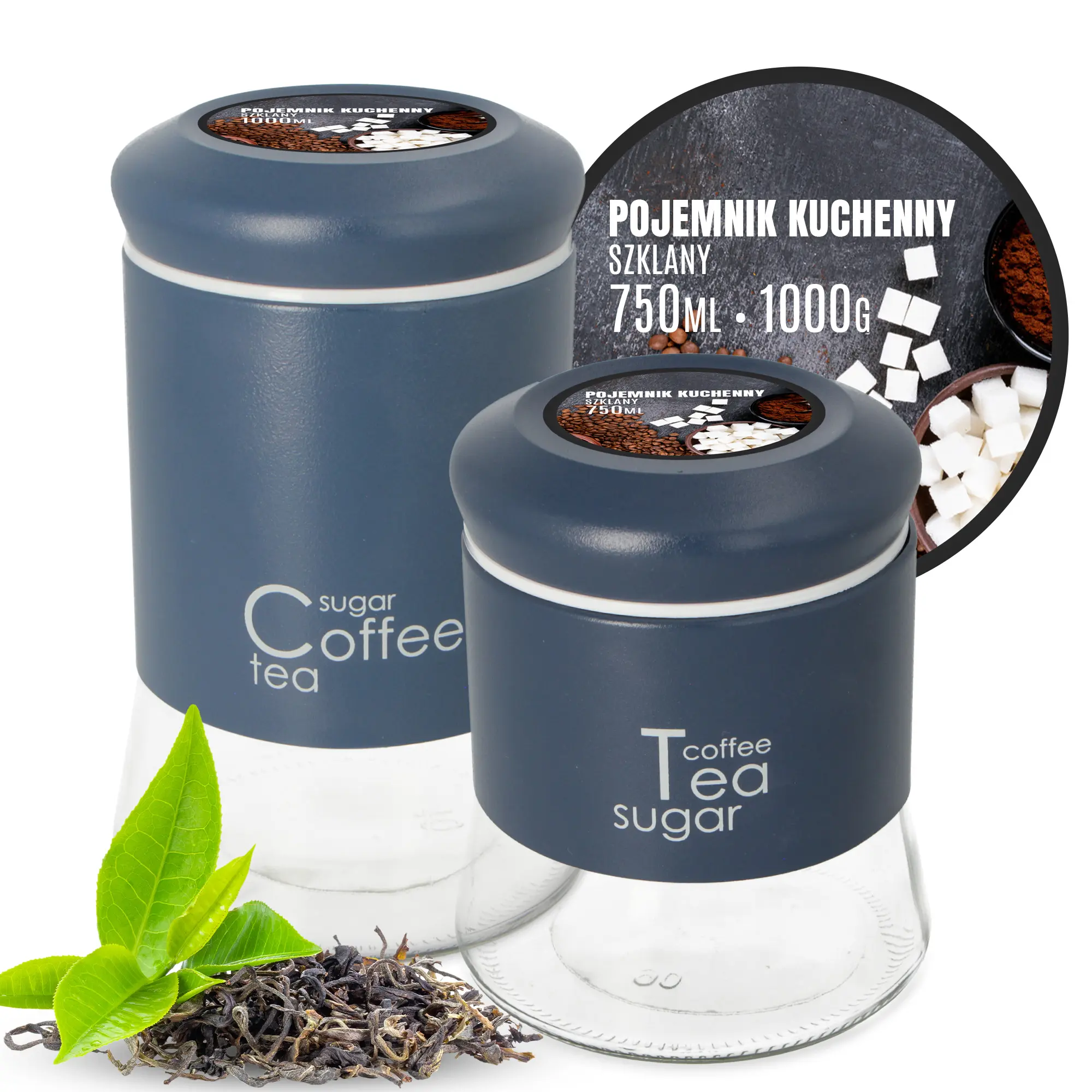 Pojemniki wyposażono w ozdobne napisy, które wyglądają niezwykle elegancko. Produkt sprawdzi się do przechowywania dowolnych produktów - kawy, herbaty, cukru, kasz, mąki, soli. Szklany, estetyczny pojemnik pięknie prezentuje się na kuchennym stole, blacie, czy w szafce z witrynką.