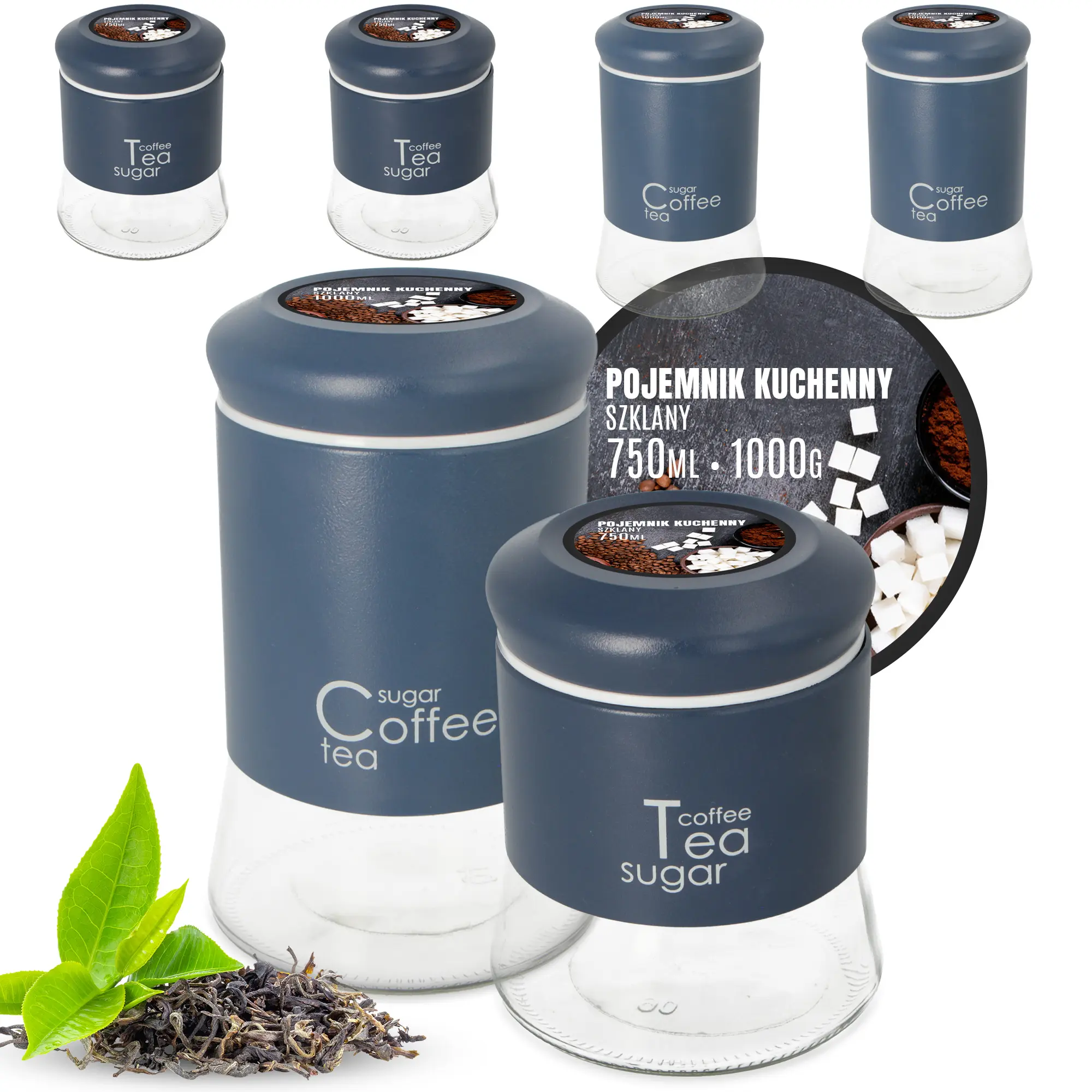 Pojemniki wyposażono w ozdobne napisy, które wyglądają niezwykle elegancko. Produkt sprawdzi się do przechowywania dowolnych produktów - kawy, herbaty, cukru, kasz, mąki, soli. Szklany, estetyczny pojemnik pięknie prezentuje się na kuchennym stole, blacie, czy w szafce z witrynką.