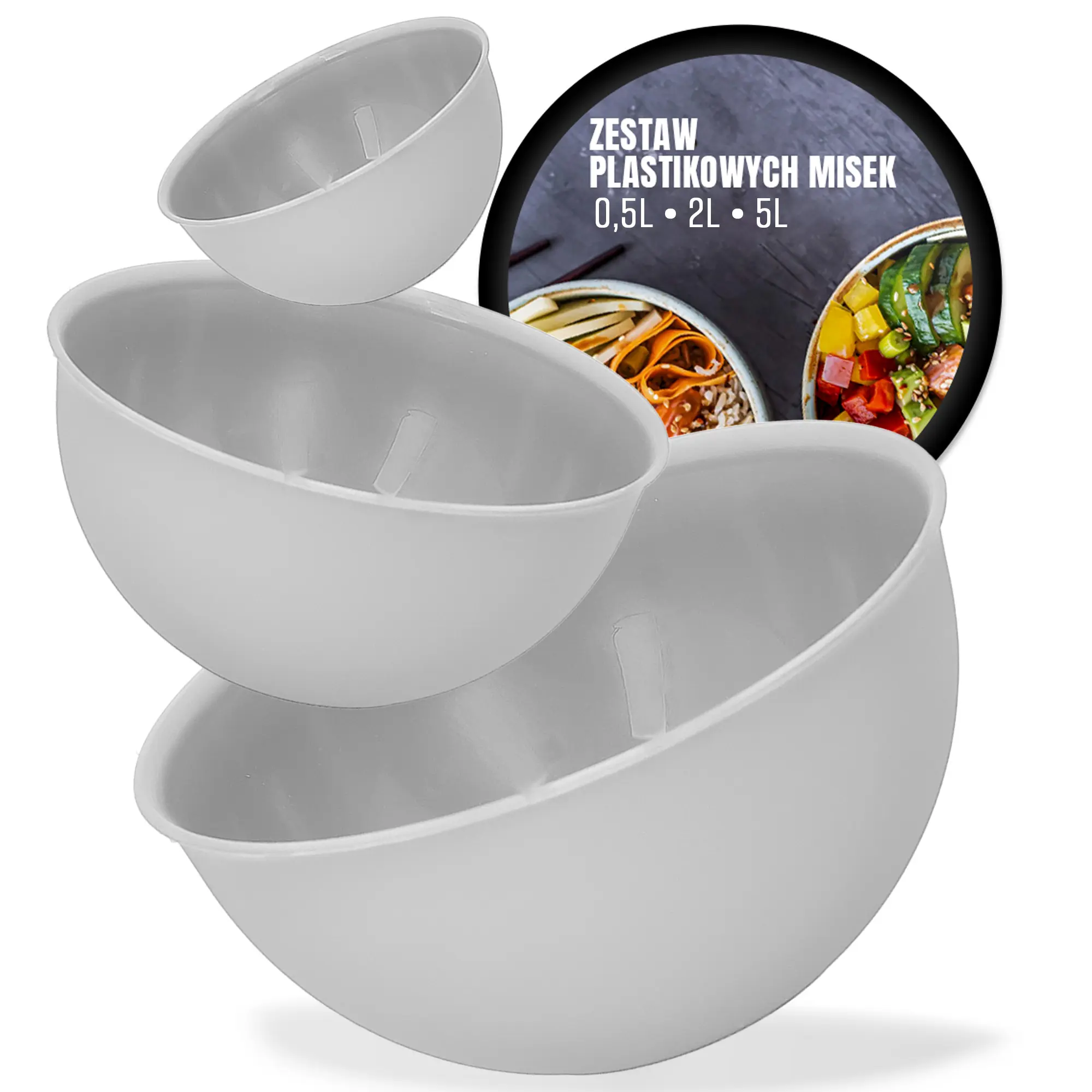 Zestaw plastikowych misek to praktyczny element, który sprawdza się w wielu sytuacjach. Miseczki przydadzą się do przechowywania jedzenia, ucierania ciasta, serwowania dań i sałatek.