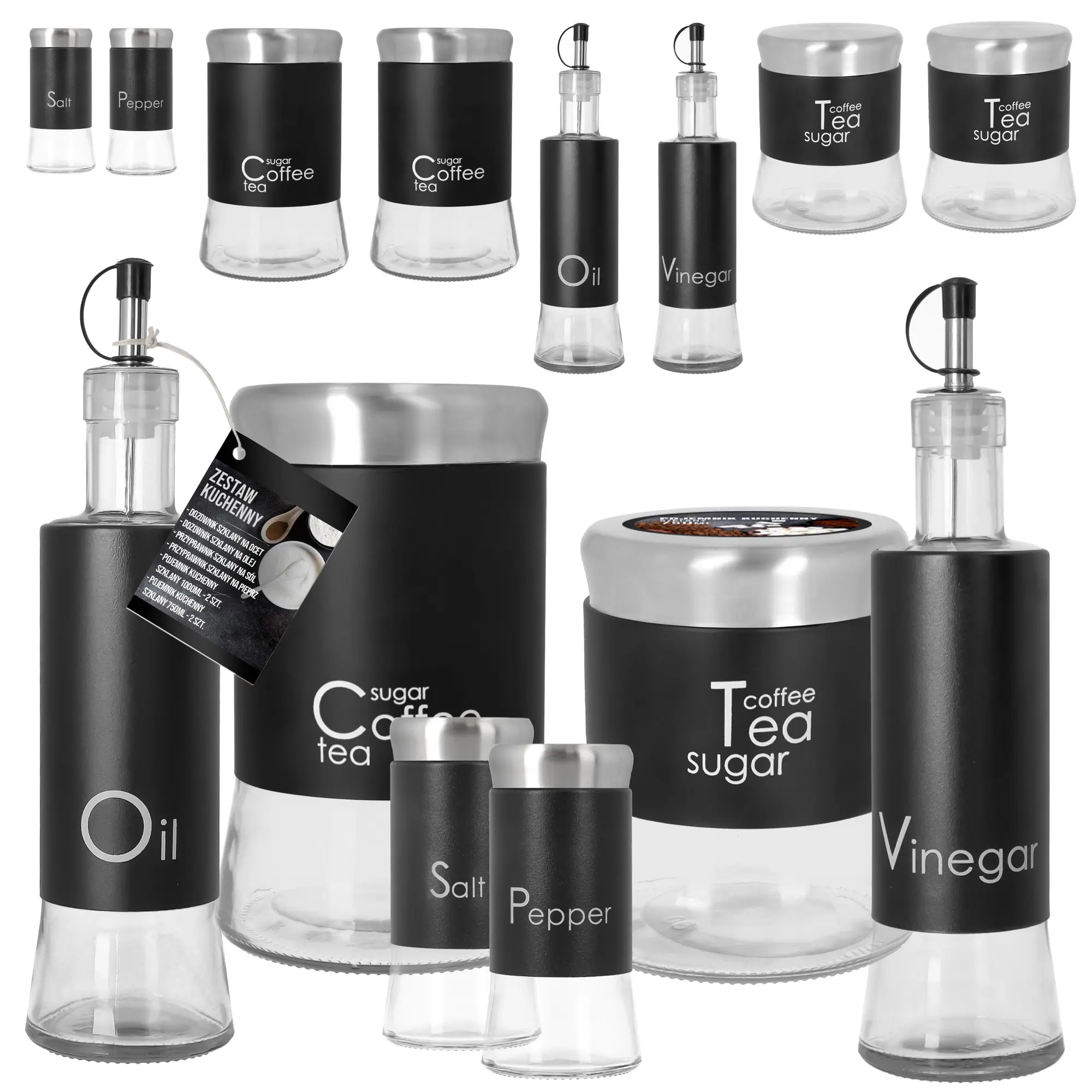 | Zawartość zestawu | 1x pojemnik na sól, 1x pojemnik na pieprz, 1x dozownik na oliwę, 1x dozownik na ocet, 2x pojemnik 1l, 2x pojemnik 0,75l |