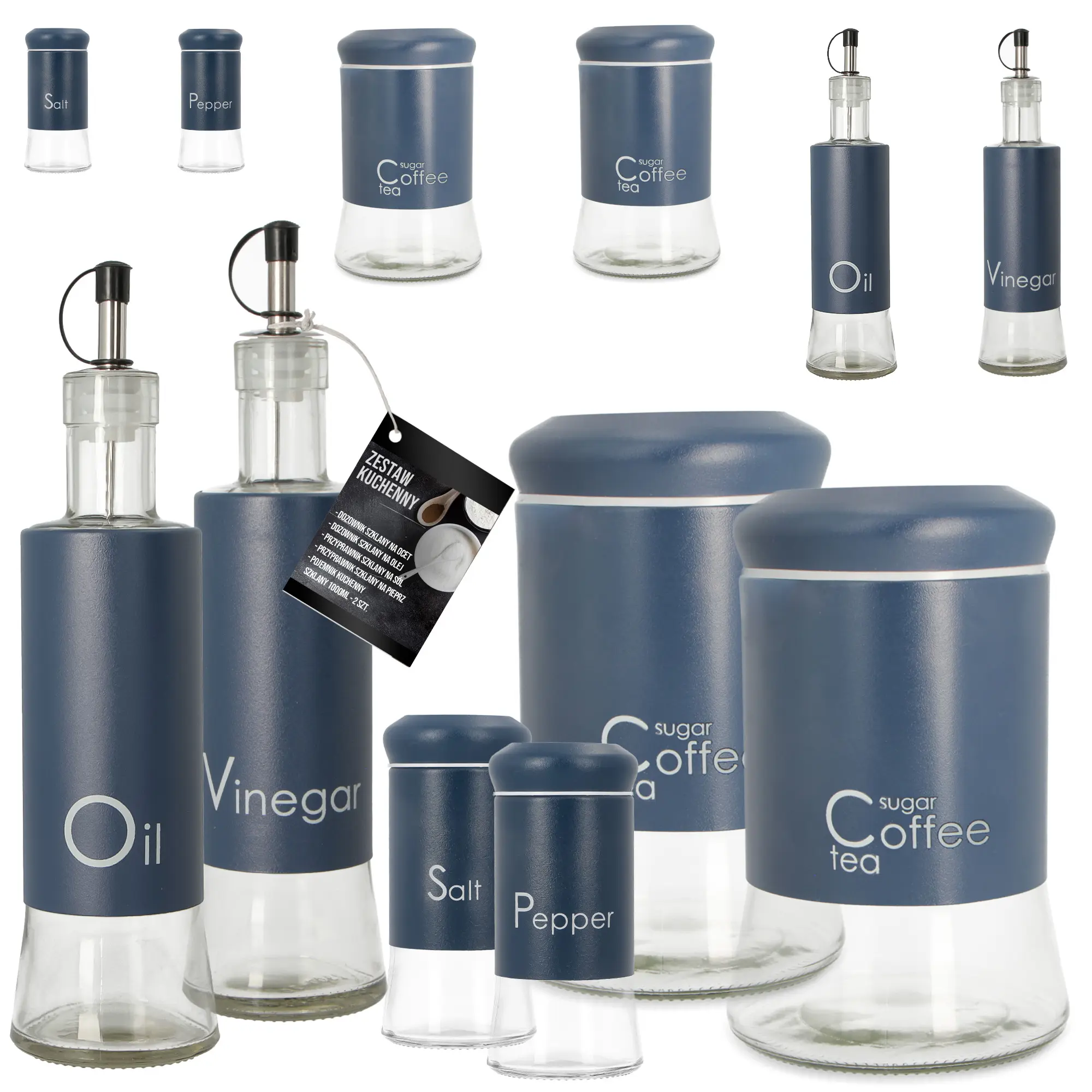 | Zawartość zestawu | 1x pojemnik na sól, 1x pojemnik na pieprz, 1x dozownik na oliwę, 1x dozownik na ocet, 2x pojemnik 1l |