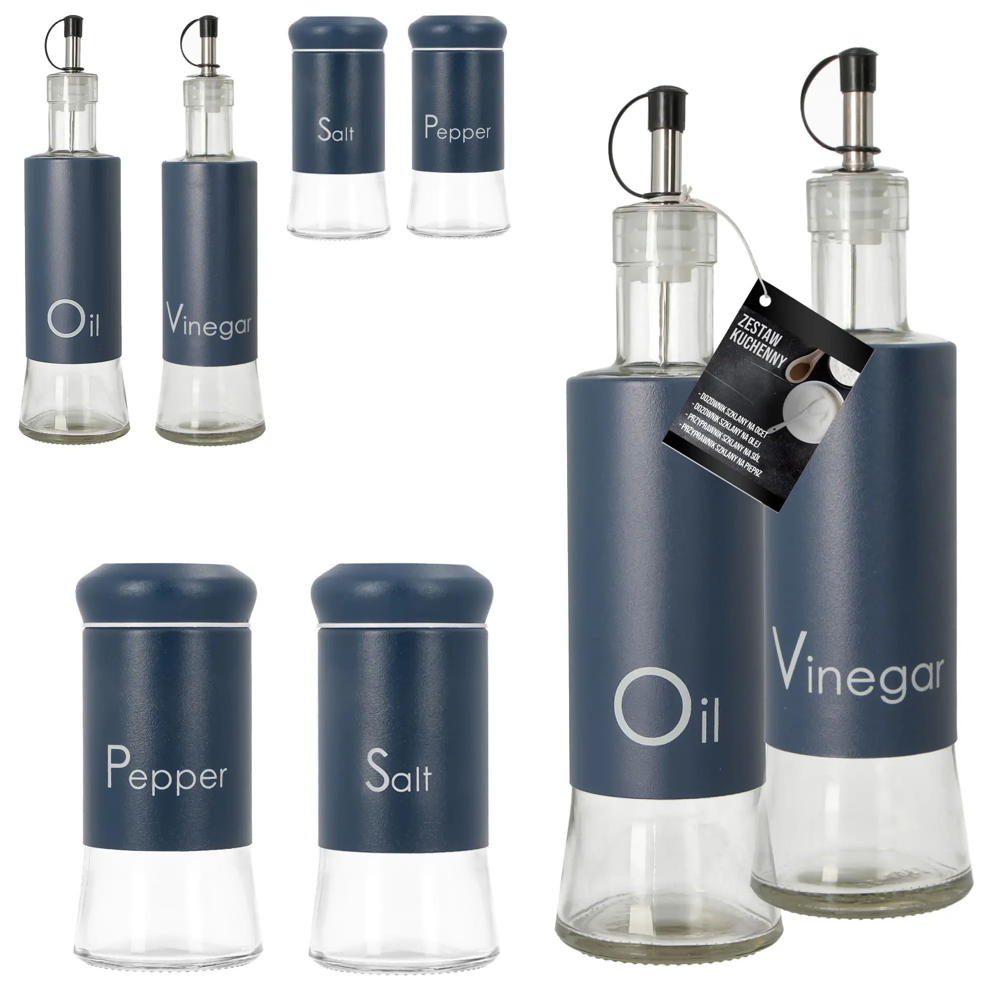 | Zawartość zestawu | 1x pojemnik na sól, 1x pojemnik na pieprz, 1x dozownik na oliwę, 1x dozownik na ocet |