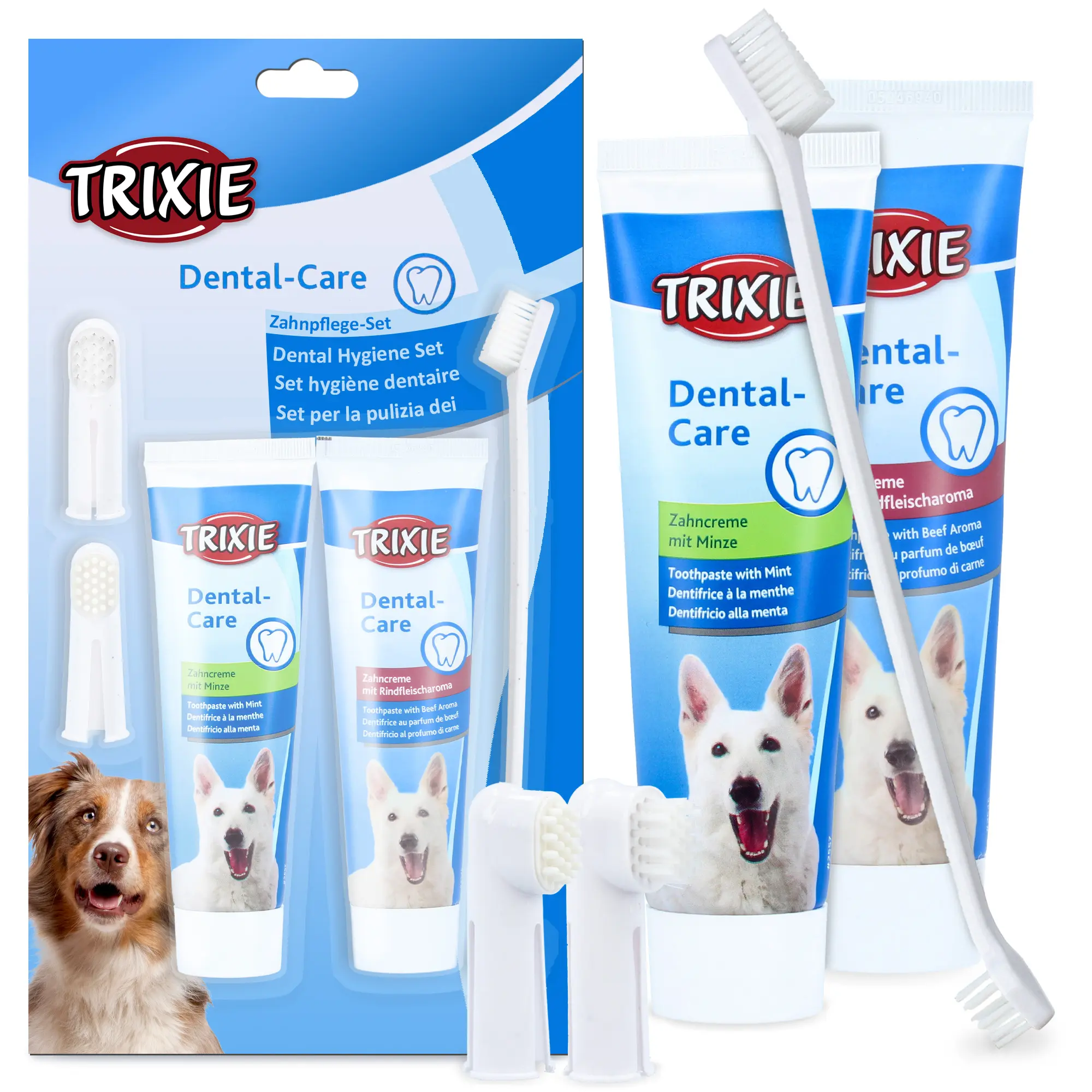 Postaw na zestaw, który zawiera wszystko, czego potrzebujesz, aby zapobiec problemom z uzębieniem zwierzaka. Dwustronna szczoteczka, nakładki na palec do czyszczenia i masażu oraz specjalna pasta zapewnią ochronę Twojemu zwierzakowi od najmłodszych lat.