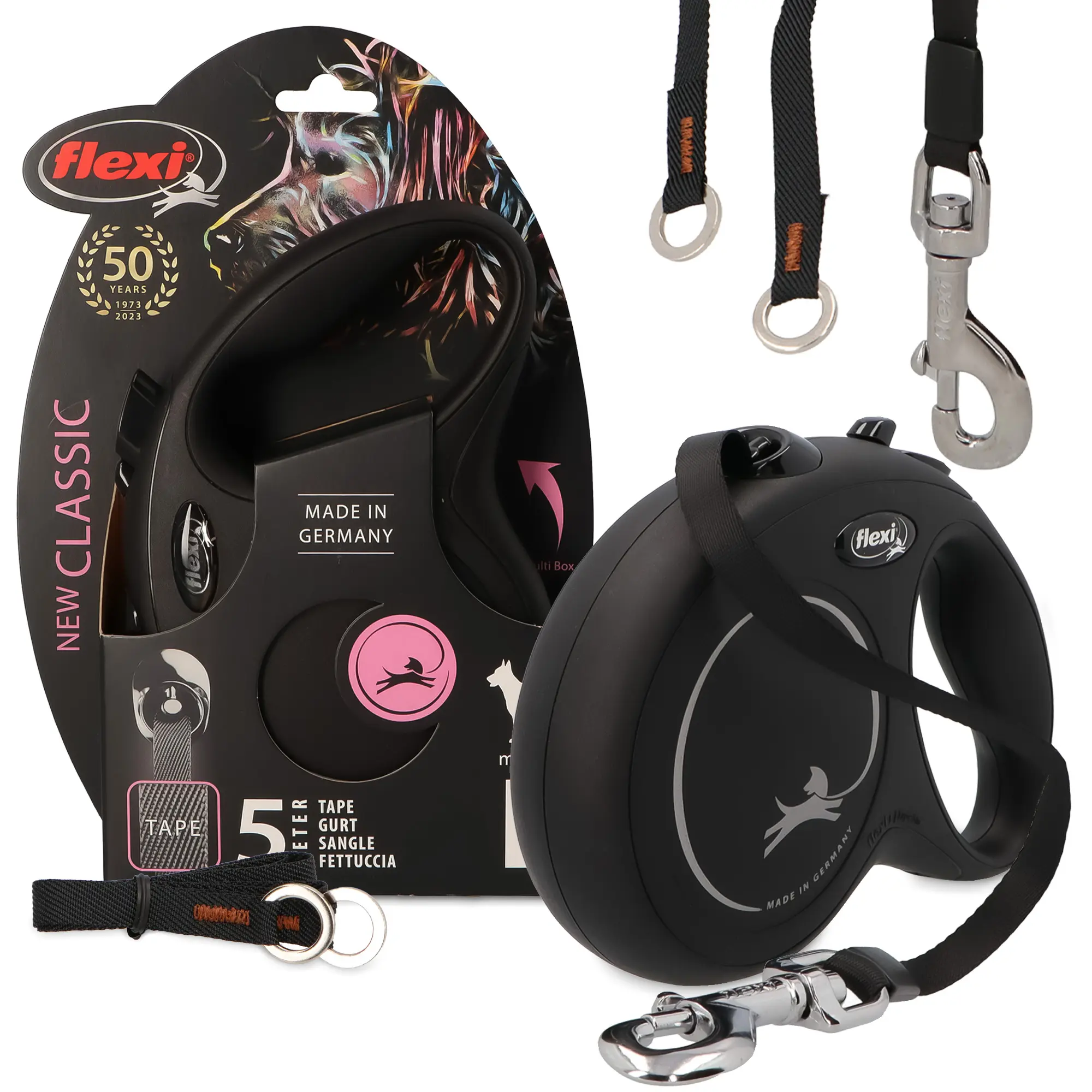 Smycz oferuje możliwość dołączenia akcesoriów takich jak pojemnik na woreczki lub lampkę LED. Produkty te można dokupić osobno. Dzięki nim spacery staną się jeszcze wygodniejsze!