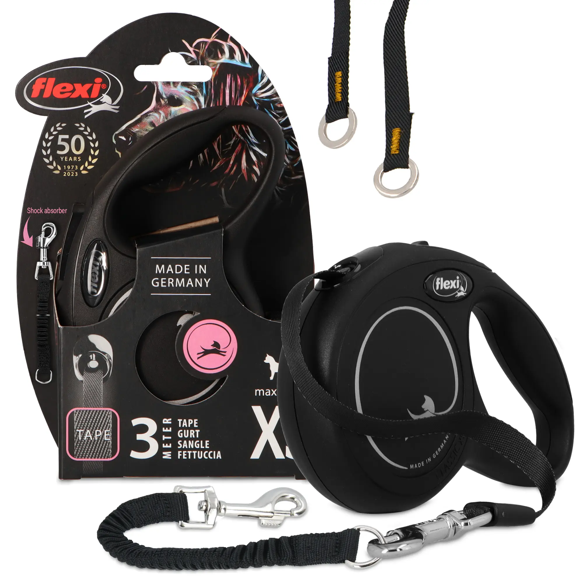 Smycz oferuje możliwość dołączenia akcesoriów takich jak pojemnik na woreczki lub lampkę LED. Produkty te można dokupić osobno. Dzięki nim spacery staną się jeszcze wygodniejsze!